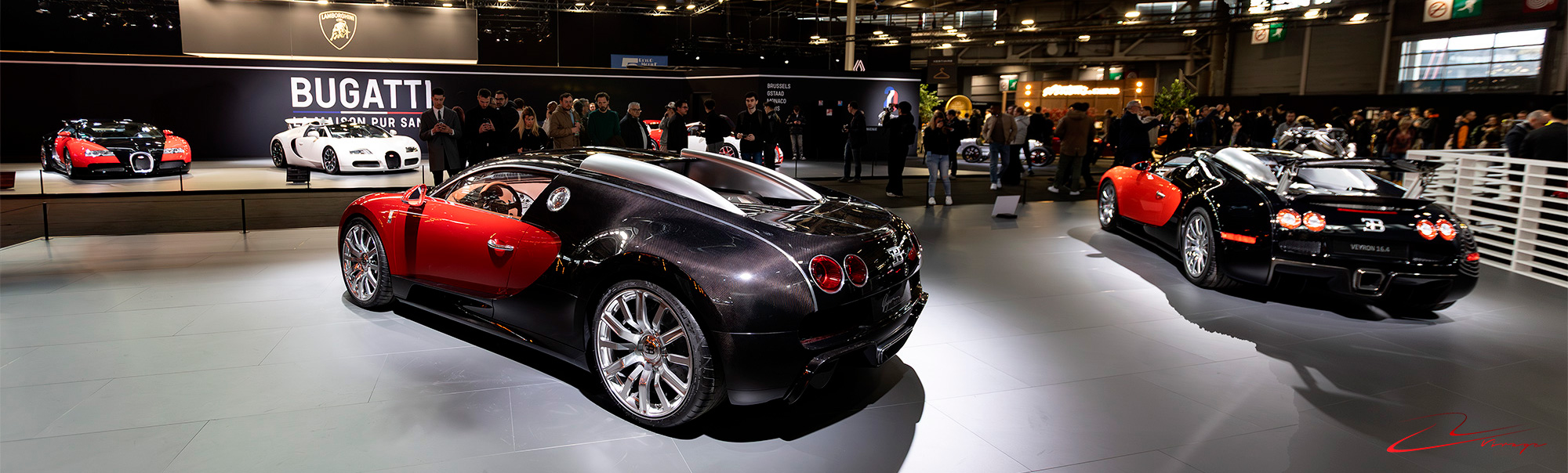 En passant derrière le stand, j’aperçois un arrière de Veyron noire et rouge et face à elle, la nouvelle Bugatti présentée seulement quelques jours auparavant. C’est un peu la déception car je pensais qu’elles allaient être exposées côte à côte. En effet, j’ai réussi l’exploit de ne rien me spoiler de ce qu’il y avait de présenté à Rétromobile ou au USG avant de venir, SAUF! une publication de Bugatti présentant les 2 autos et annonçant qu’elles seraient présentes ici.